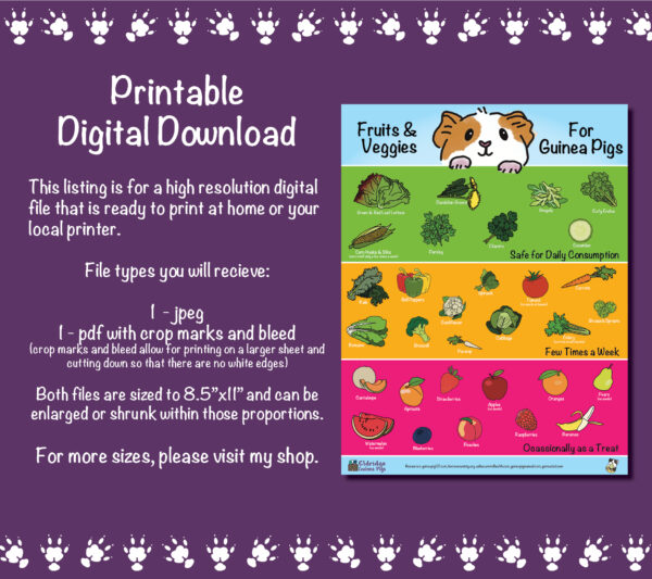 Use this decorative infographic poster to help you remember what fruits and vegetables your guinea pigs can eat and how often they can eat them to help keep your piggies happy and healthy.