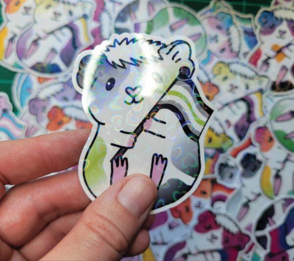 Water resistant guinea pig heart holographic laminated vinyl sticker for decorating your laptop, phone, car, water bottle, skateboard, wall and more! It also makes the perfect gift for any guinea pig lover!