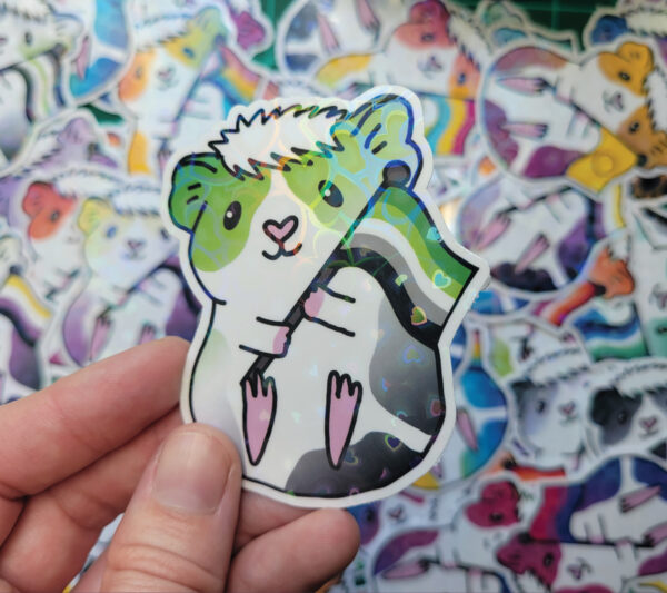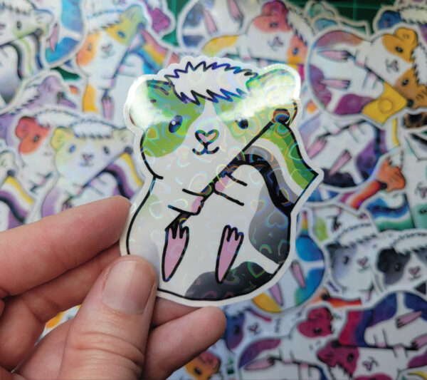 Water resistant guinea pig heart holographic laminated vinyl sticker for decorating your laptop, phone, car, water bottle, skateboard, wall and more! It also makes the perfect gift for any guinea pig lover!