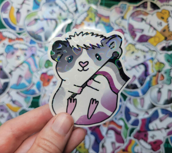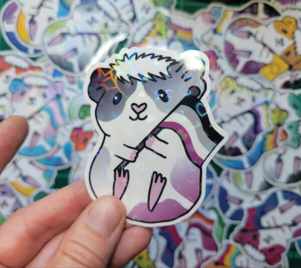 Water resistant guinea pig heart holographic laminated vinyl sticker for decorating your laptop, phone, car, water bottle, skateboard, wall and more! It also makes the perfect gift for any guinea pig lover!