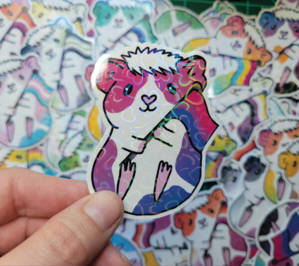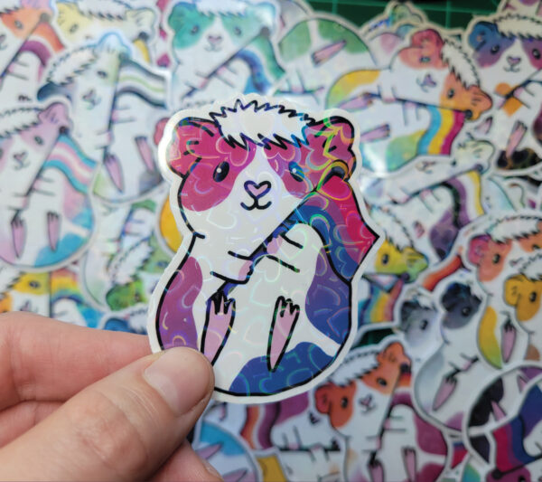 Water resistant guinea pig heart holographic laminated vinyl sticker for decorating your laptop, phone, car, water bottle, skateboard, wall and more! It also makes the perfect gift for any guinea pig lover!