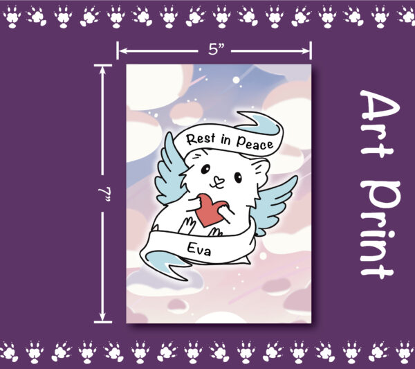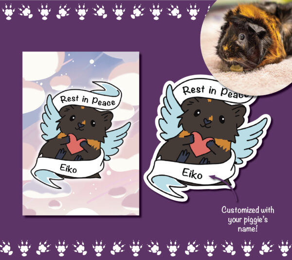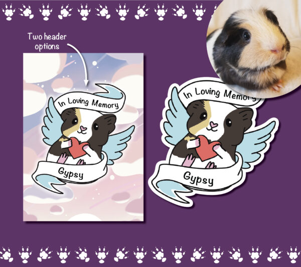 Memorialize your guinea pigs as angels with a custom portrait 5″x7″ art print or 3″ waterproof sticker.