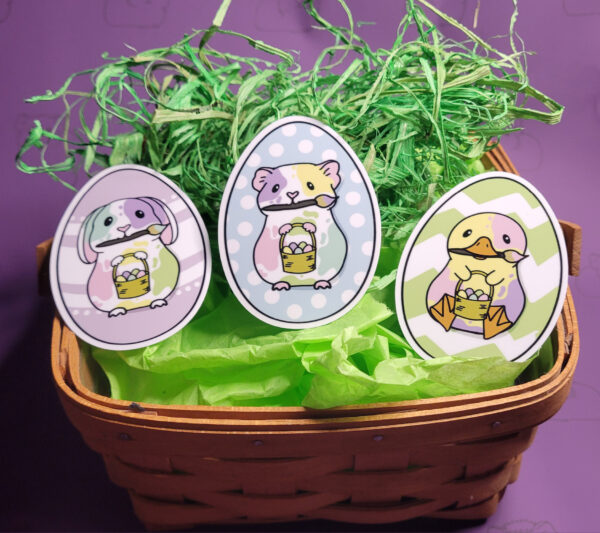 These adorable pets have been busy painting Easter eggs for you! Add these adorable stickers to your baskets this year! Choose a bunny, guinea pig, duckling, or all three!