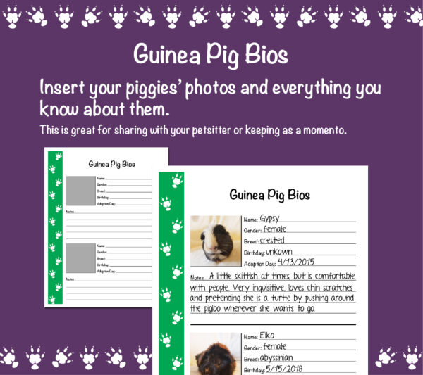 – GUINEA PIG BIOS – Pages to fill in your guinea pigs’ information and profile pics.