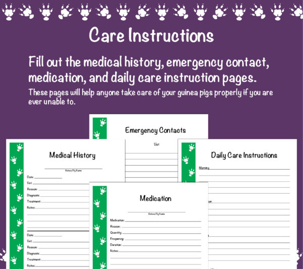– DAILY CARE INSTRUCTIONS – A page to fill in your daily routine for guinea pig care.