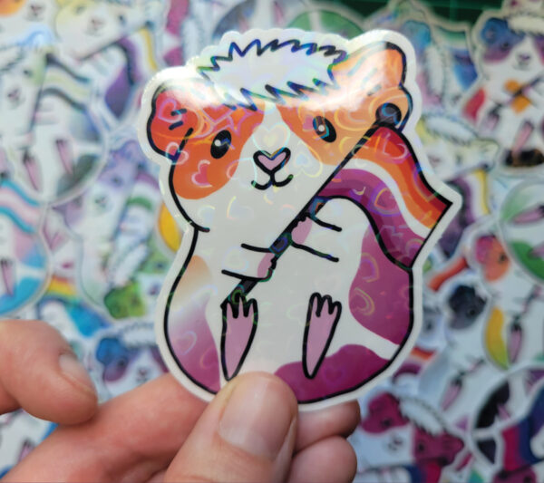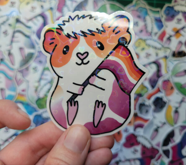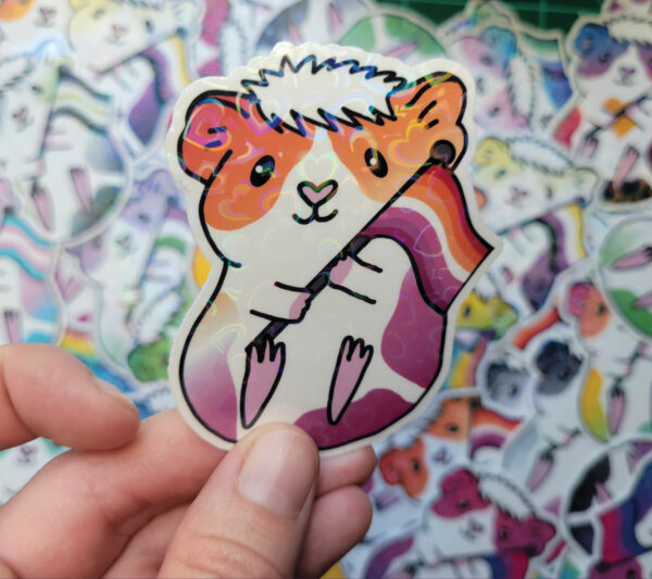 Water resistant guinea pig heart holographic laminated vinyl sticker for decorating your laptop, phone, car, water bottle, skateboard, wall and more! It also makes the perfect gift for any guinea pig lover!