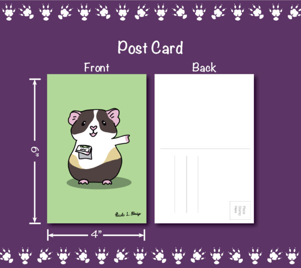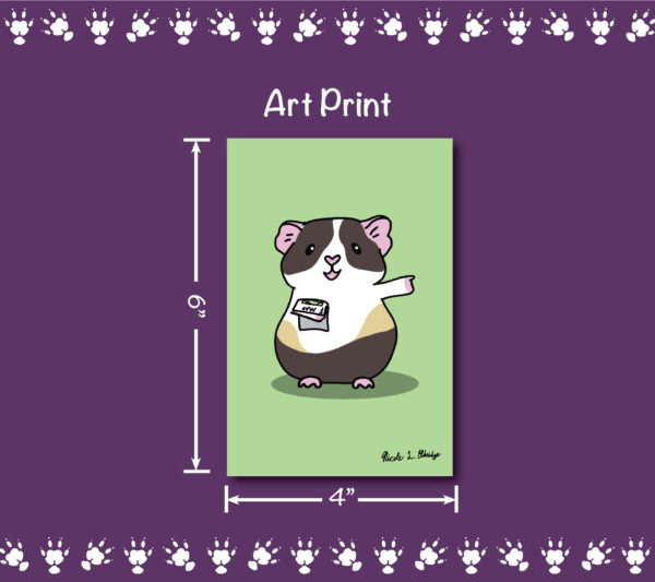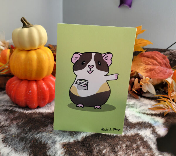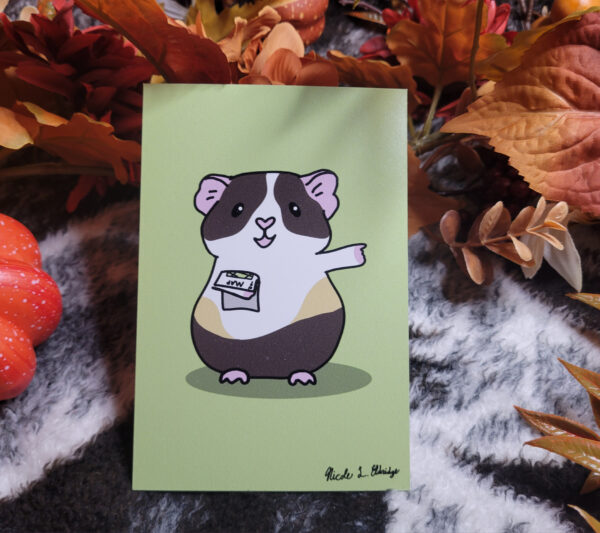 Available as an art print, folding card, and postcard. Use a post card to write a friend or family member, or maybe use a folding card as a birthday card for the guinea pig fanatic in your life, or maybe just hang an art print on your wall to bring you joy day after day.